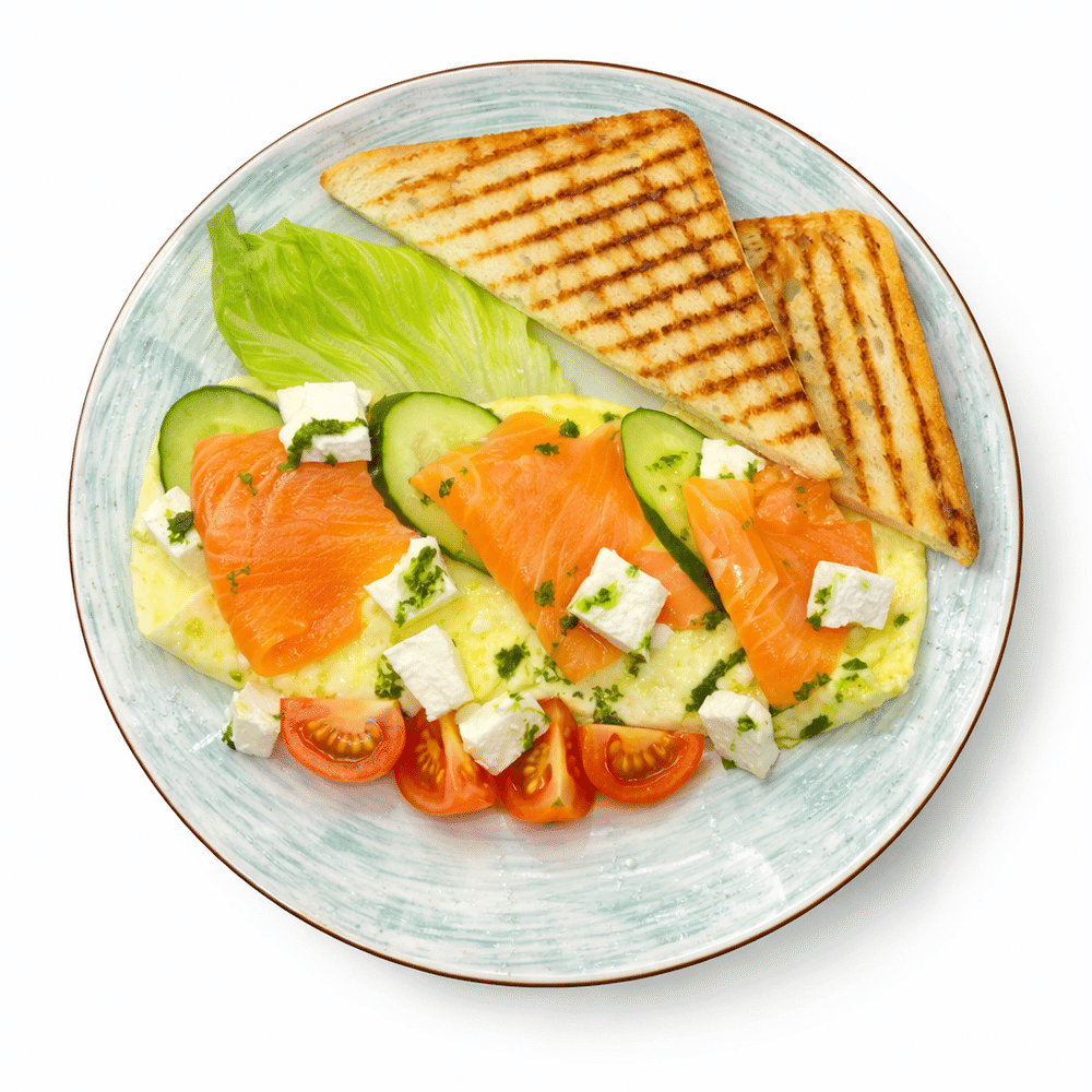 Желток и белок пастеризованные, форель или лосось слабосоленый, огурцы, томаты черри, сыр фета, микс салатных листьев, пшеничный тост, соус песто.