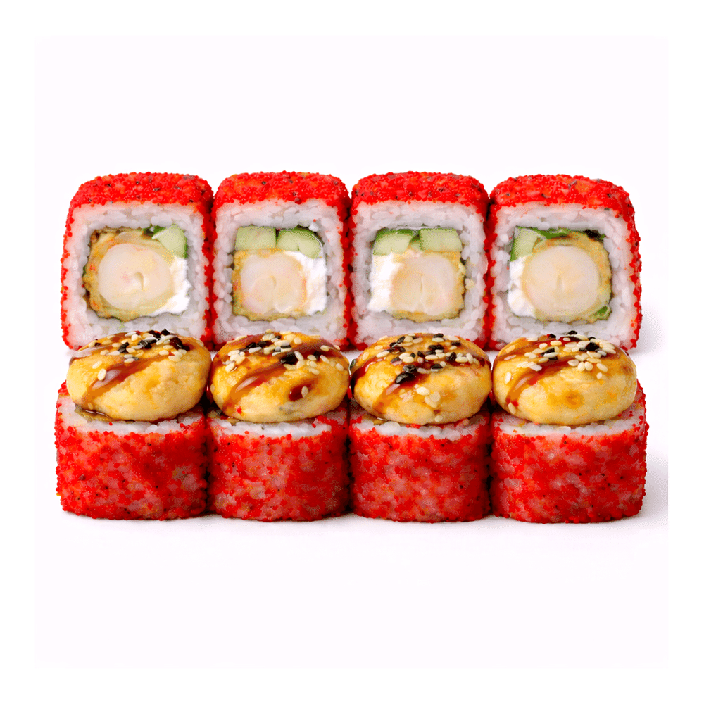 Креветки тигровые темпура, огурец, сыр сливочный, икра тобико, спайси соус, кунжут, соус терияки, рис, водоросли нори