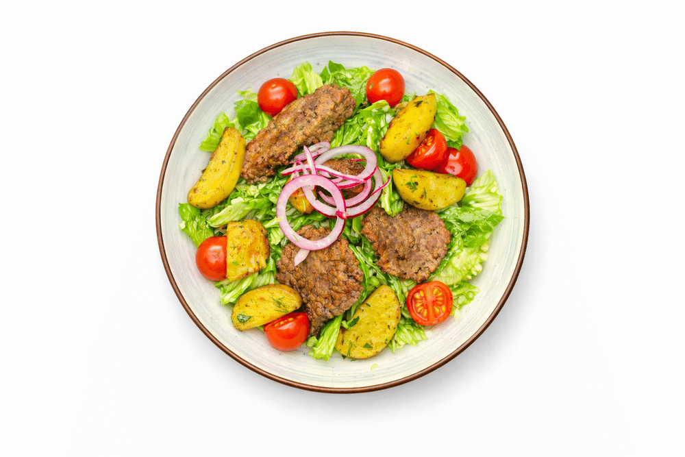 Мраморная говядина, микс салатных листьев, огурцы маринованные, картофель запечённый, томаты черри, соус "Цезарь", красный лук