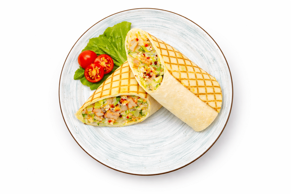Куриное бедро, лепешка тортилья, микс салатных листьев, маринованные огурцы, красный лук, томаты, белый соус.