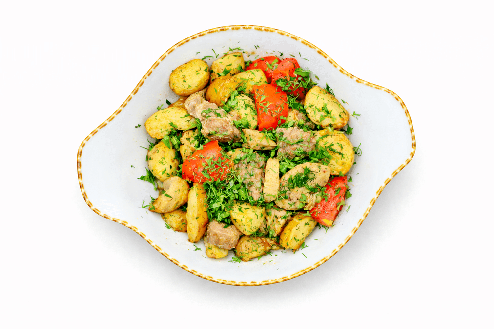 Свиная шея, картофель, лук, шампиньоны, томаты, зелень.