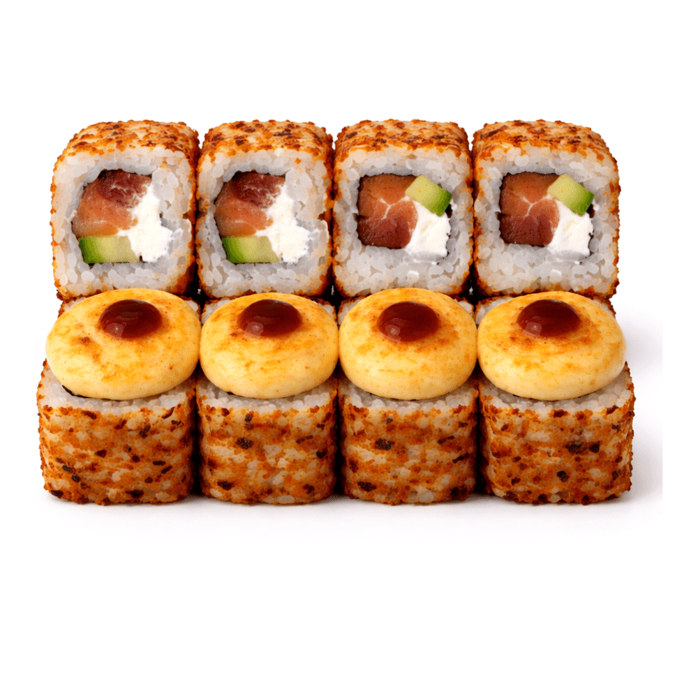 Лосось, тунец, сыр сливочный, авокадо, спайси соус, лук фри, соус терияки, рис, водоросли нори