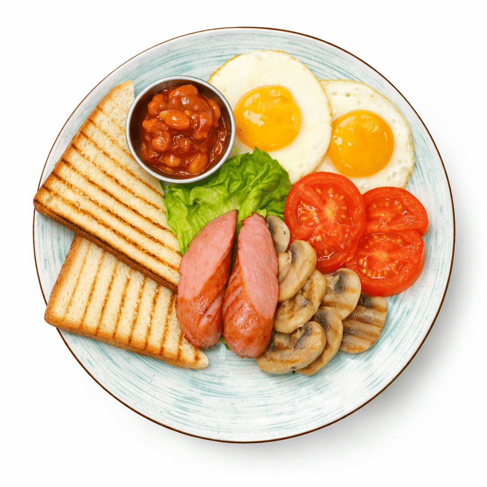 Желток и белок пастеризованные, сосиска жареная, томаты гриль, шампиньоны гриль, соус по-грузински, пшеничный тост, микс салатных листьев.