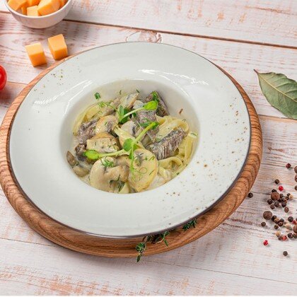 Паста тальятелле, сливочный соус, бекон, желток пастеризованный, пармезан, руккола, томаты черри.