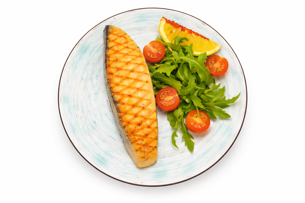 Филе лосося, руккола, томаты черии, лимон, паприка.
