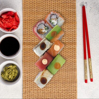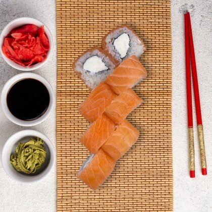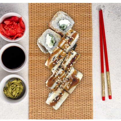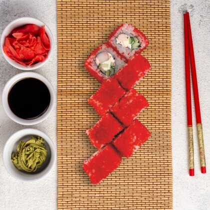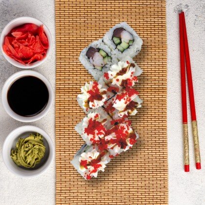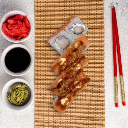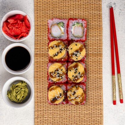 Лосось, креветки тигровые, авокадо, сыр сливочный, икра тобико, соус ореховый, соус кунжутный, рис, водоросли нори