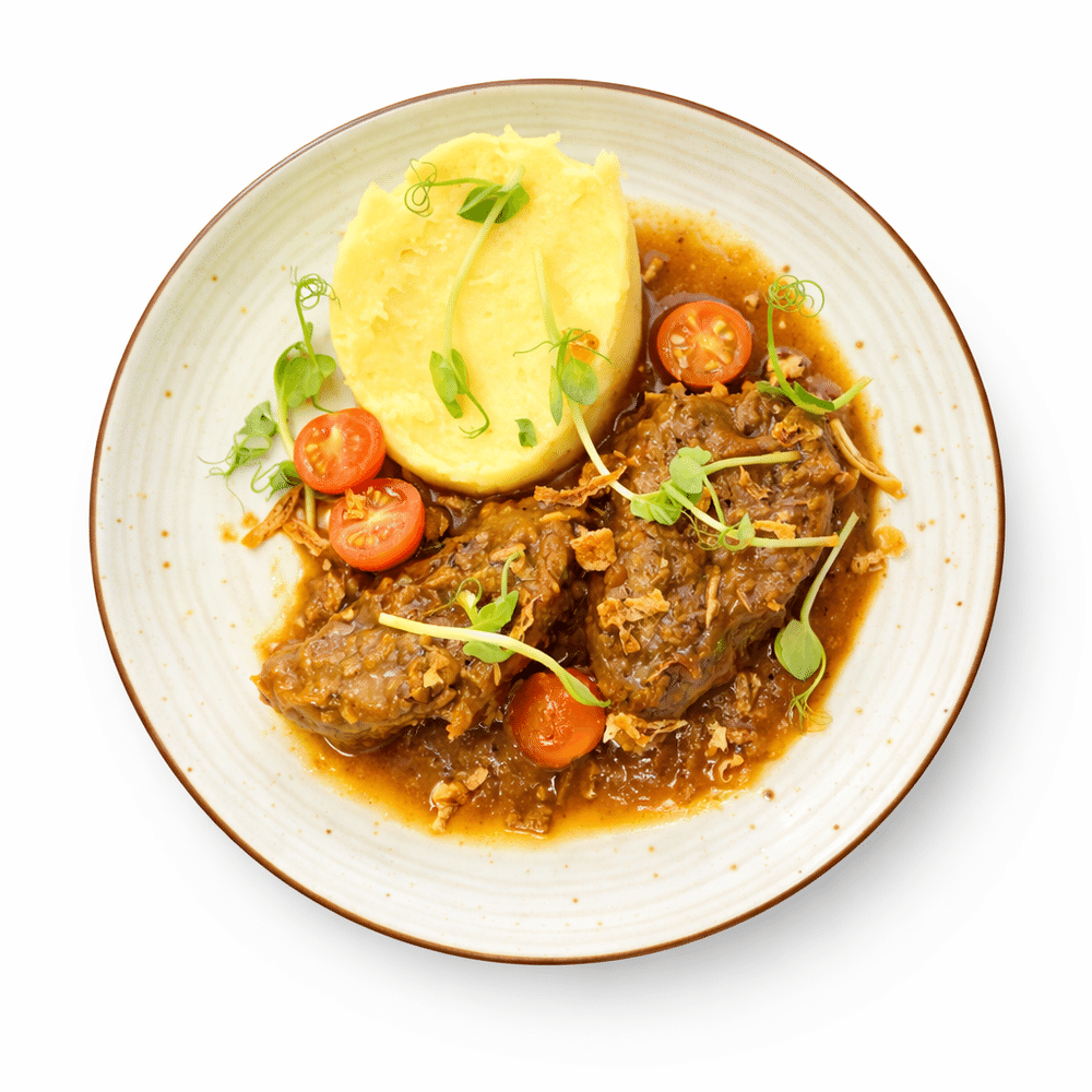 Томленые говяжьи щечки в соусе Демиглас, картофельное пюре, томаты черри, зелень.
