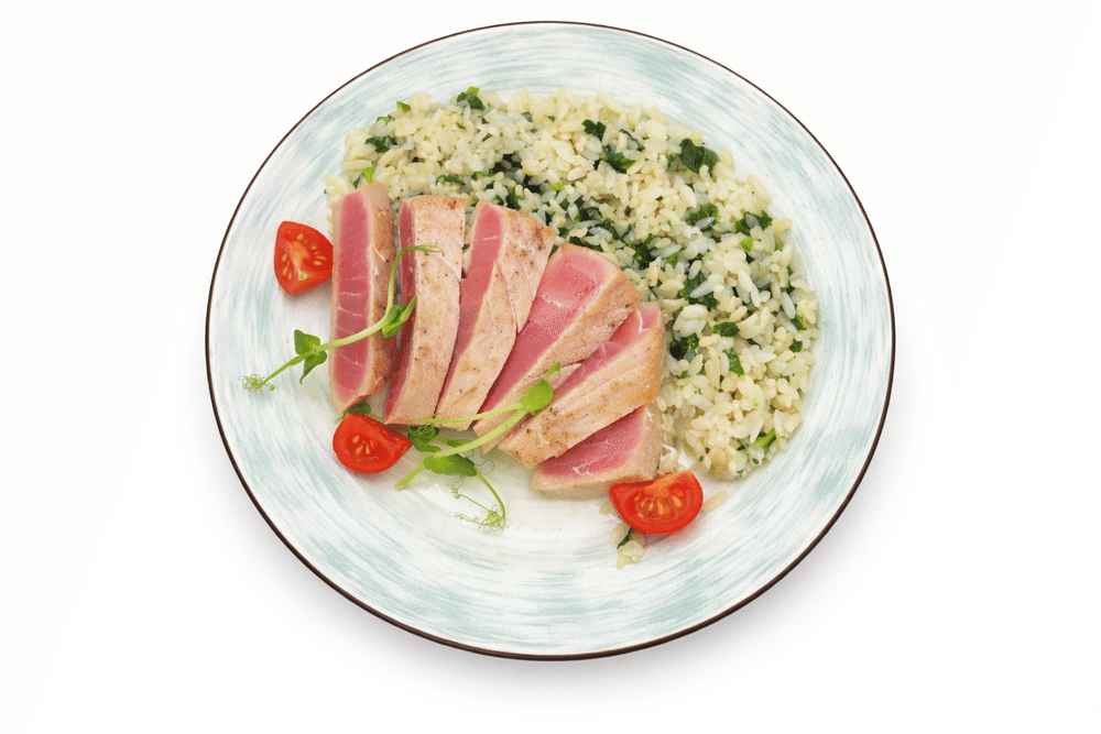 Тунец на гриле, рис, шпинат листовой, томаты черри, зелень.