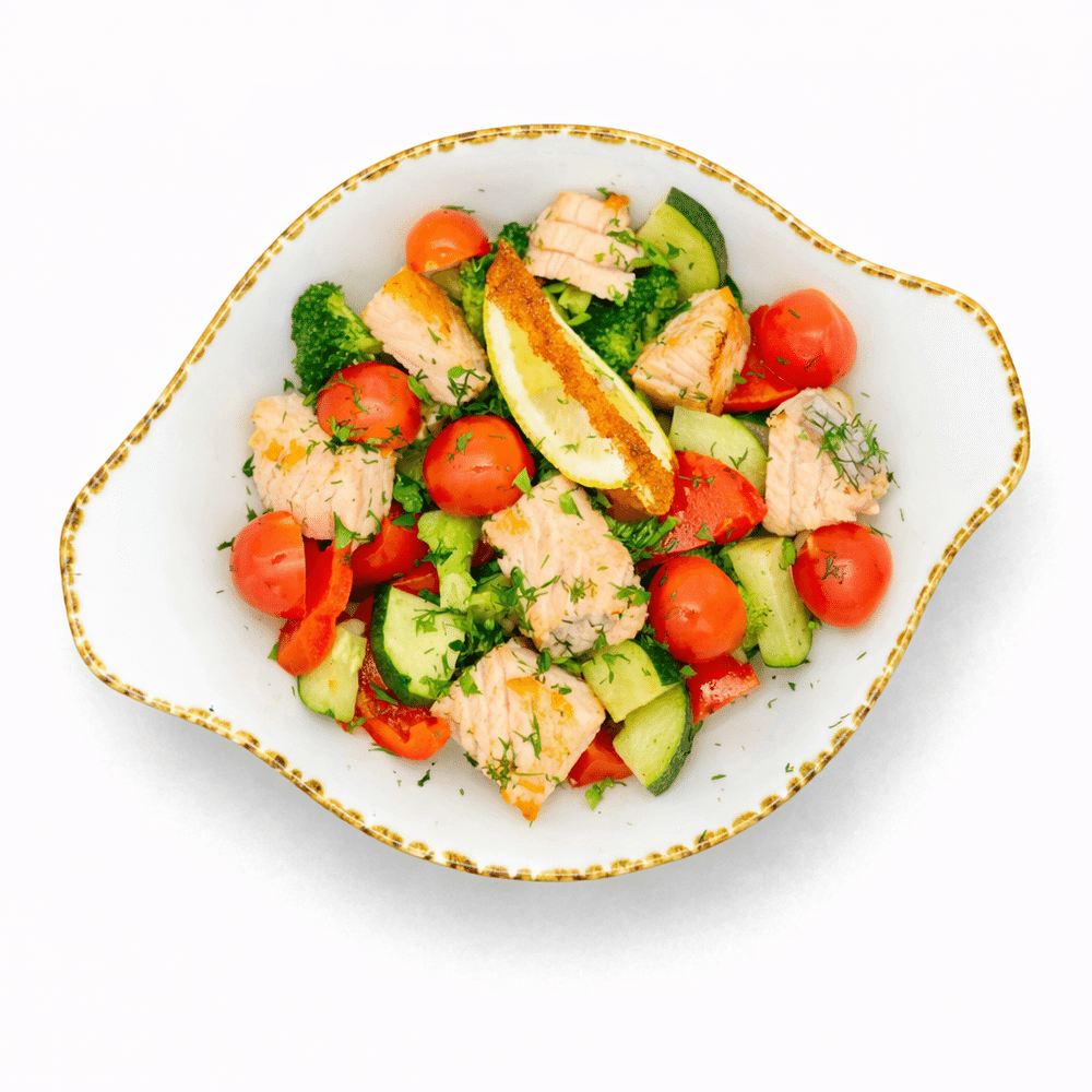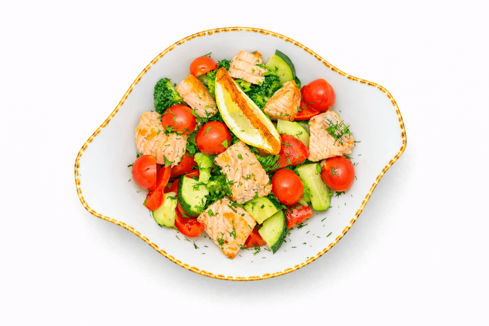 Форель Племзавода Адлер, капуста брокколи, кабачок, перец болгарский красный, лимон, паприка, томаты черри, зелень.