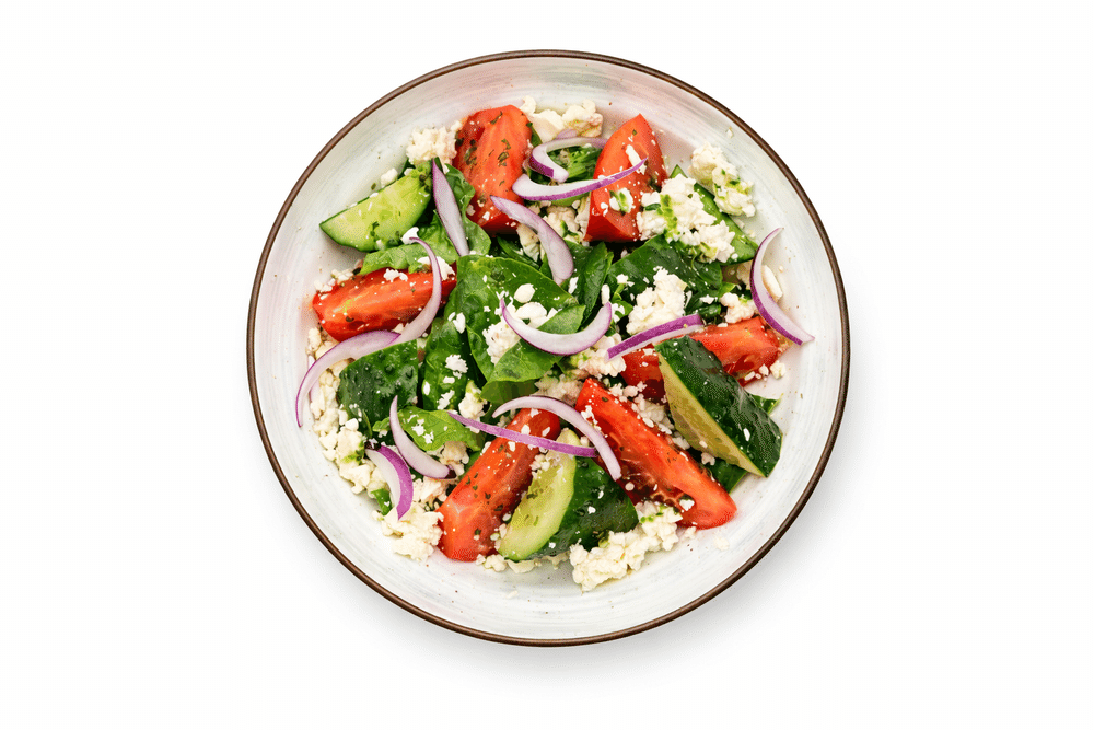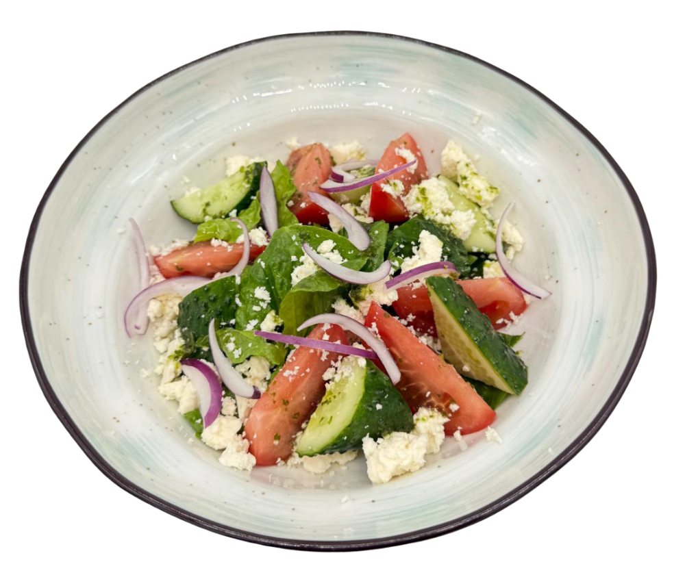 Микс салатных листьев , томаты розовые, огурцы, красный лук, сыр Чанах , соус песто