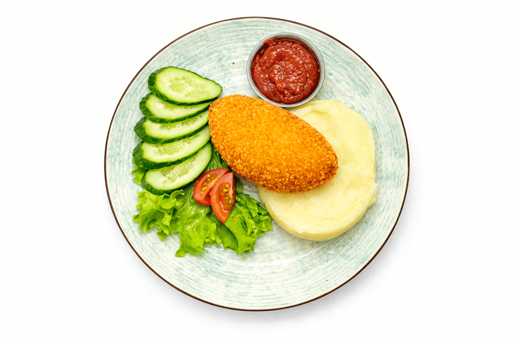 Котлета из куриного филе, картофельное пюре, огурцы, салат листовой, соус по-грузински.